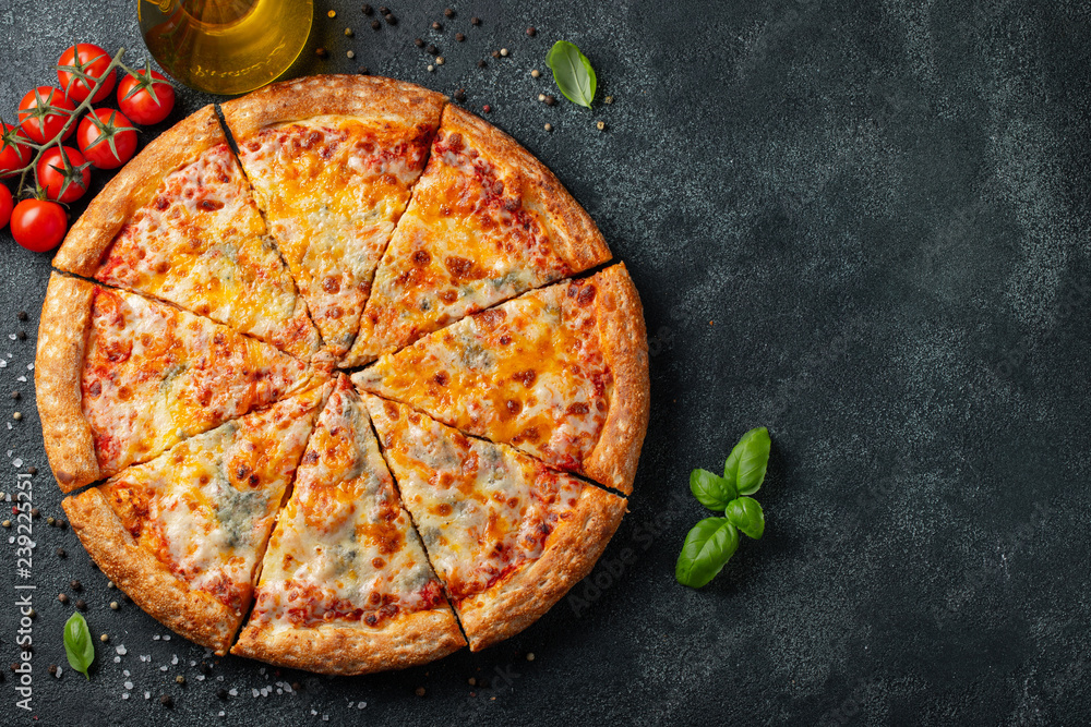 Аппетитные фото пиццы с четырьмя видами сыра на эффектном черном фоне