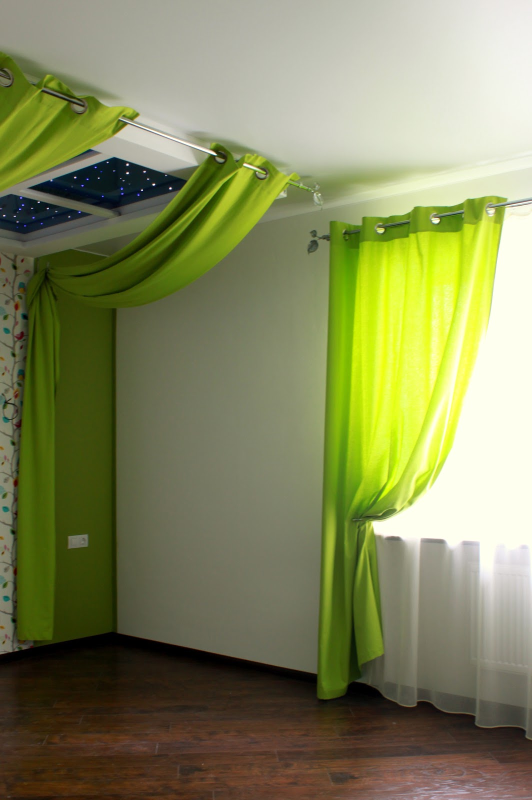 Идеи дизайна с желто-зелеными шторами на фотографиях